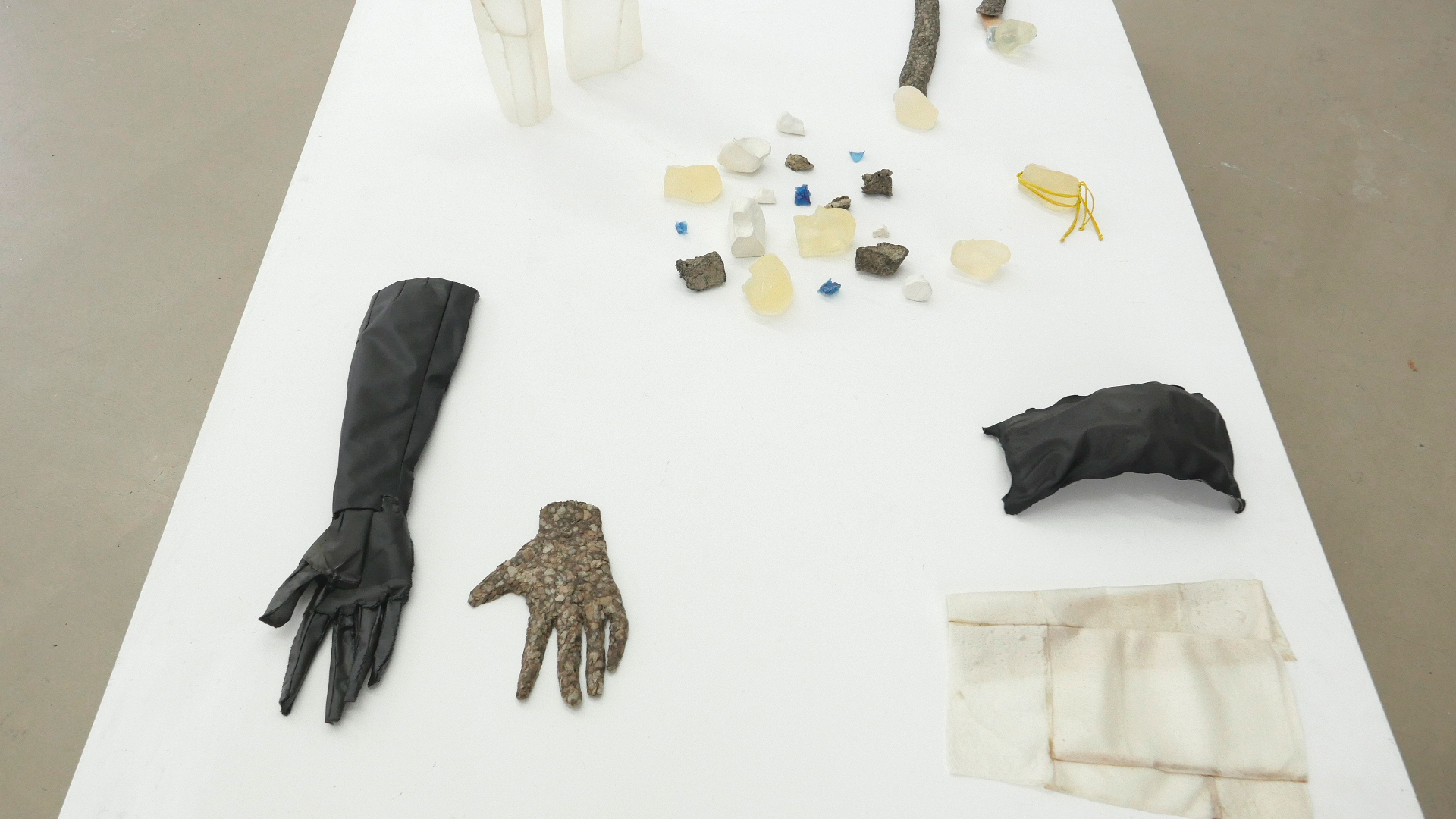 This kinetic installation incorporates everyday synthetic objects alongside materials made from agar and gelatine. These biodegradable materials resonate with the body as a temporary, decaying form of matter, particularly with the figure of the zombie, which in my practice functions as a speculative, posthuman persona.
