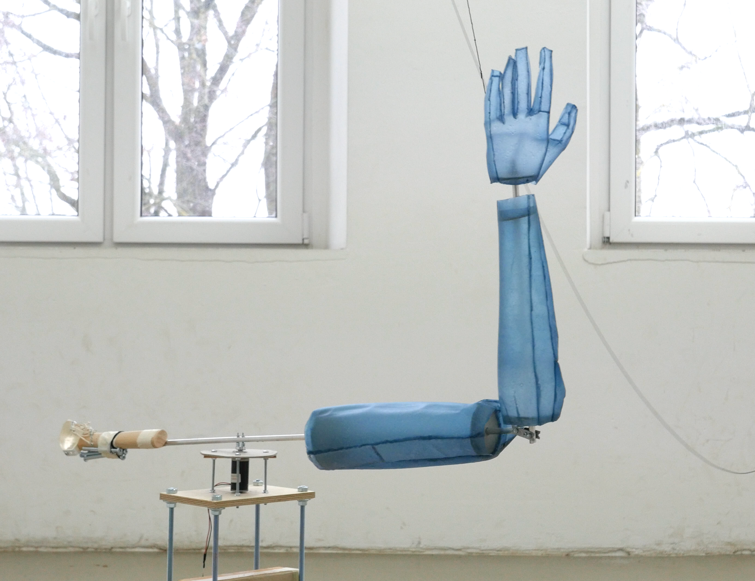 This kinetic installation incorporates everyday synthetic objects alongside materials made from agar and gelatine. These biodegradable materials resonate with the body as a temporary, decaying form of matter, particularly with the figure of the zombie, which in my practice functions as a speculative, posthuman persona.